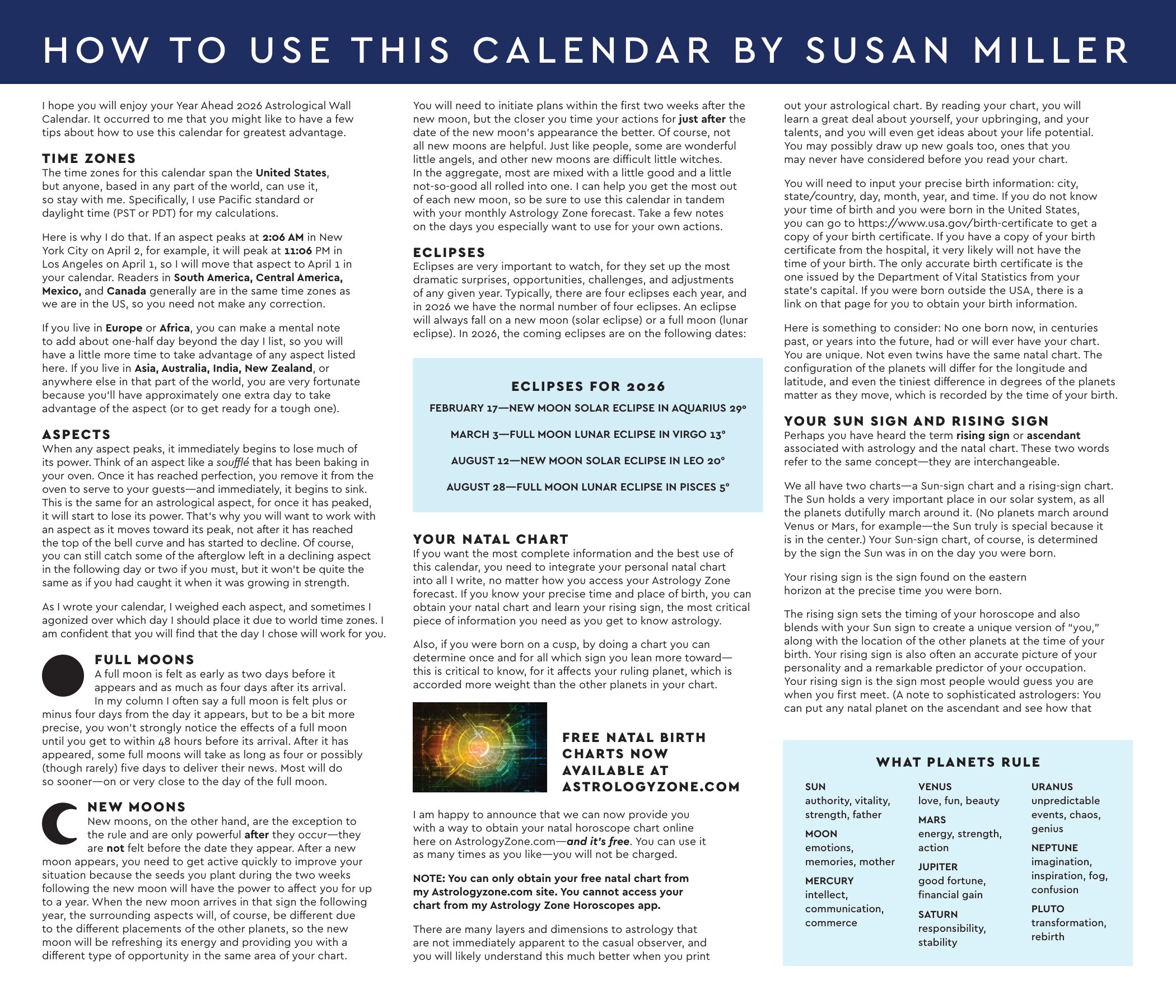 Susan’s Astrology Zone® Calendar, available annually, brings her trusted forecasts and celestial insights into a beautifully illustrated format for readers to enjoy throughout the year.