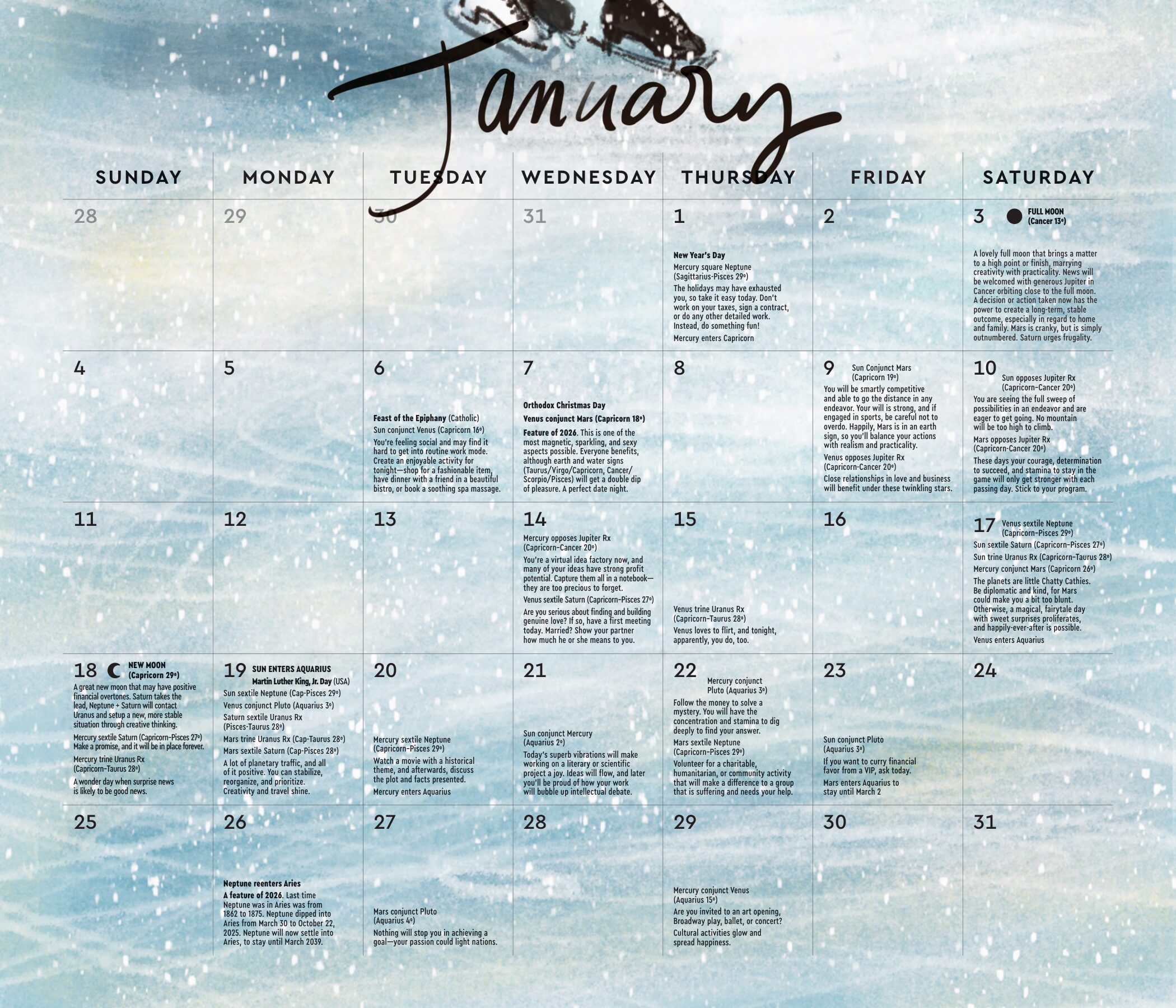 The Year Ahead 2026 Astrological Wall Calendar showcases original illustrations by Izak Zenou. Printed on premium archival paper, it’s made to be treasured. Izak Zenou’s artwork enhances Susan Miller’s astrological guidance, giving each month a beautifully artistic and inspiring feel.