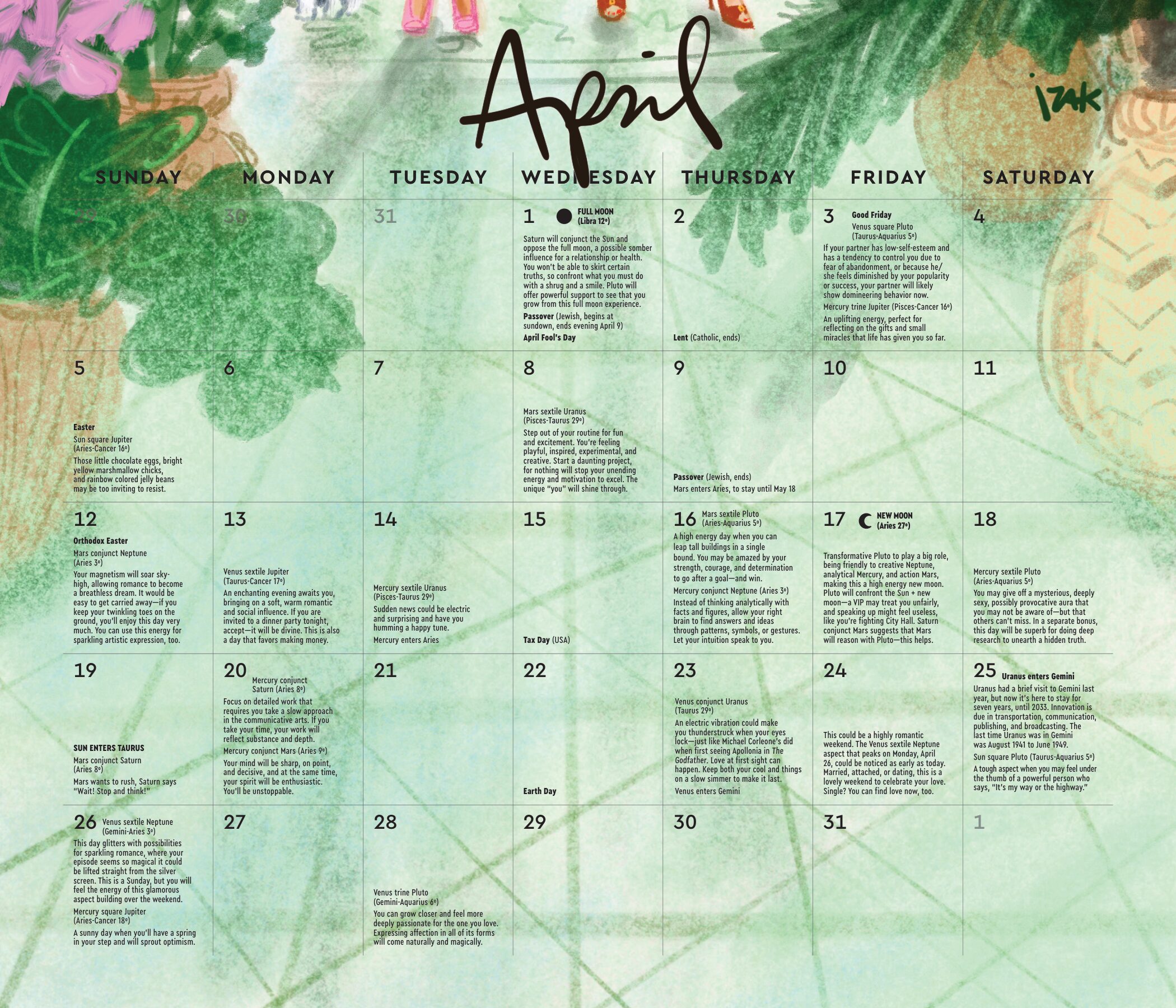 Each page features original artwork by celebrated French fashion illustrator Izak Zenou, whose graceful, hand-drawn style brings Susan’s astrological insights to life. His illustrations make this astrology calendar as beautiful as it is informative.